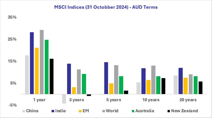 Returns over the last 10 years for equities have outstripped most other asset classes. The MSCI World has generated a return of 13.1% p.a. over this period in AUD terms. This has been predominantly driven by US Tech firms like Meta Platforms (Facebook), Microsoft, Netflix, Amazon, Apple, Google and more recently the likes of Nvidia.
