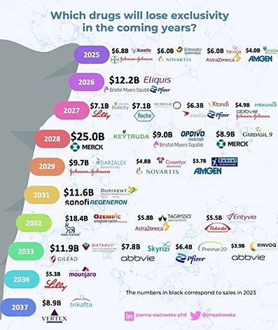 The global pharmaceutical industry faces a significant patent cliff, with over $300 billion in sales at stake in the coming years. Nearly 200 drugs are set to lose patent protection within the next decade, including 69 blockbuster medications, each generating over $1 billion in annual sales. This wave of patent expirations presents both challenges and opportunities for the industry, reshaping revenue streams and competitive dynamics.