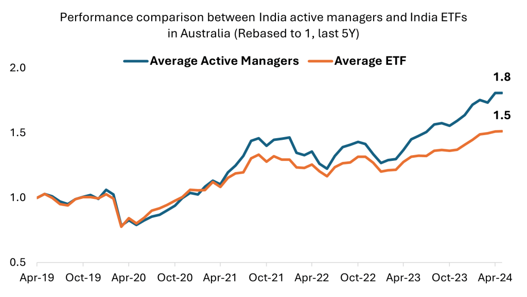 To gain exposure to India’s growth story without incurring substantial slippage/costs, active management utilising local infrastructure and cost frameworks is likely to provide a more effective approach. When we aggregate the performance of active managers to compare with India ETFs, we find that on average the active managers perform significantly better than ETFs.